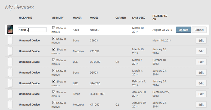 5. Click on the Update button to the far right to save your changes after you have renamed devices. These changes are universal, so they will now apply to all Google properties. That means all of your visible devices will be renamed in the Play Store Compatible devices list, as well as in Android Device Manager and so on.
